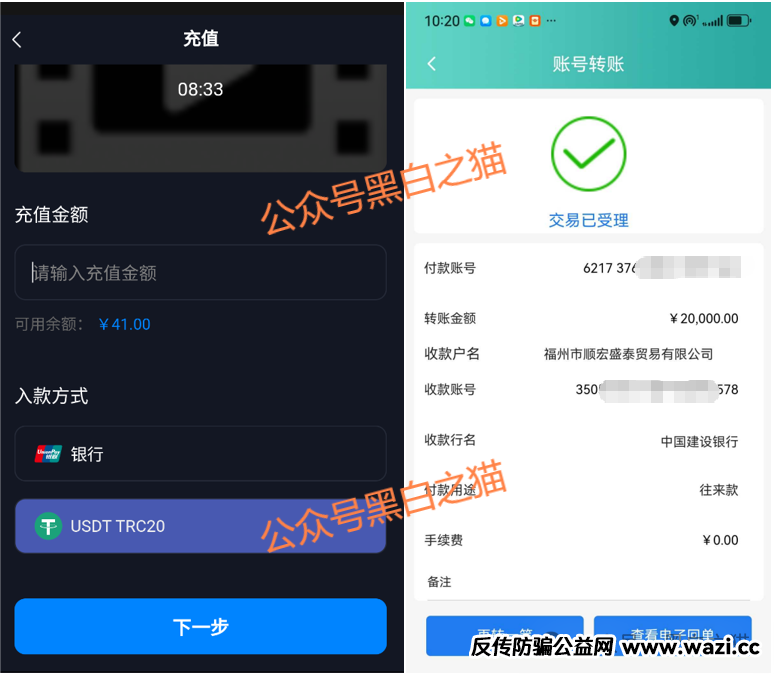 根据读者提供的聊天记录和转账记录,充值分为银行卡和USDT方式,银行卡充值都是国内的企业账户。