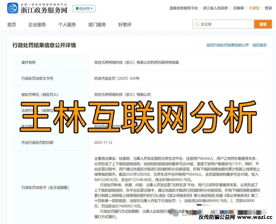 11月12日,杭州市余杭区市场监督管理局经调查发现,平台违反《禁止传销条例》,因此做出罚款没收违法所得的行政处罚,罚没款合计7489093.78元,目前已经改名,警惕!