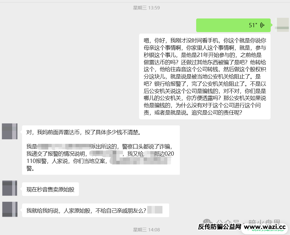 就在前些天一位粉丝向小诺透露关于“秒音”的新情况,其母亲在银行向秒音公司转账5万元意图购买该平台上销售的产品。银行工作人员问为什么向这家公司转账,其母亲说这家公司要上市了,现在买产品加入就送股权,上市后我把股权变现能赚很多钱。听到这样的说辞,银行的工作人员怀疑老人被网络资金盘洗脑,立刻向辖区派出所报案。派出所民警来到现场后详细了解了事情经过,老人向民警说明了秒音公司股权上市的情况。民警根据老人的说辞和秒音的宣传资料基本断定为涉诈、涉传公司。随后民警查询了老人最近几年的大额转账记录。看到其参与过众多网络资金盘项目。比如:雷达币、永倍达等。大家都知道这些项目都已经崩盘了。民警看到老人有多次被骗的经历,马上联系了其家人,也就是小诺的这位粉丝。向其说明情况后,并告知要求家人止付老人的全部银行卡、微信和支付宝账户。以保证老人在醒悟之前不再被此类骗局洗脑,最大限度的保护老人的财产和资金不受损失。