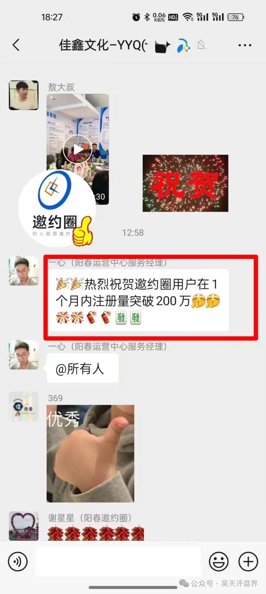 “邀约圈”这个资金盘昊天之前曾多次预警及爆料,相信看过的粉丝都没有被骗,这个骗局很简单就是单纯的拉人投资999元,然后拿推荐奖,说推广用户奖最终可分红每年50万?模式就不用昊天重复发了之前曝光过不懂的可以看往期文章,直接上硬核资料:据受害者向昊天爆料目前app已经关网了,200万会员,每人999,大家算算多少钱吧…