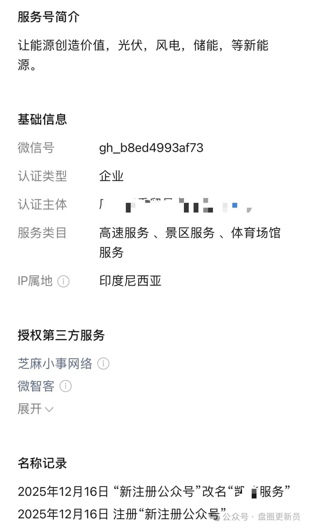 凯能服务,目前还在引流推广阶段,具体名称暂且不清楚,骗子利用公众号平台引流,发布一些引流文章,以前曝光过不少一模一样的骗局,看介绍估计又是打着能源噱头的诈骗平台,骗子的ip显示的是在印尼,注册的认证主体都不沾边,后面会持续关注,因为还在引流,具体什么模式还不清楚,大概率是分红模式资金盘。