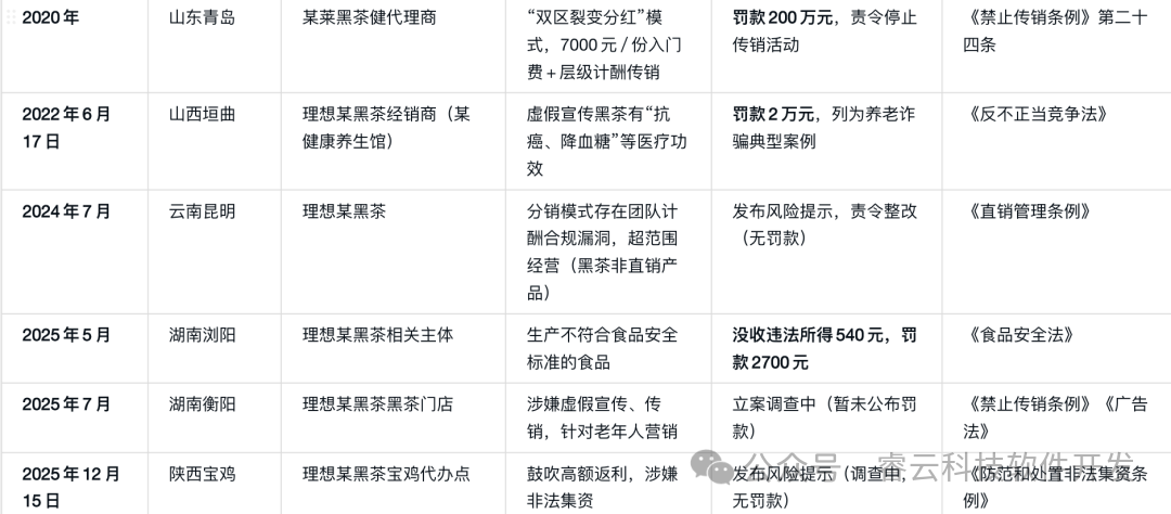 • 2012年,湖南某黑茶企业因采用“入门费+三级以上返利”模式,被认定涉嫌传销,罚款120万元;