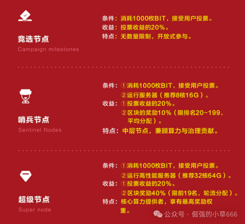 二是节点等级制度暗藏拉新压力。项目设置三类节点,均需质押1000枚BIT才能参与。从“备选节点”到“超级节点”,等级越高,所需投入越大,拉人头带来的分红也越多。尤其是“超级节点”全网仅19个,竞争激烈,迫使参与者不断拉人、加大投入,形成典型的层级裂变结构。