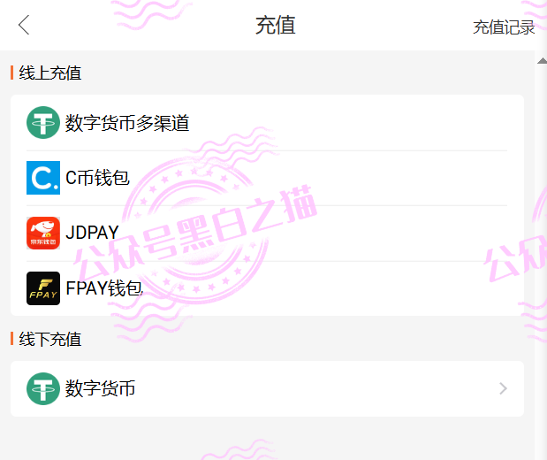 充值界面上除了常见的USDT外,还有大家不熟悉的C币钱包、JDPAY、FPAY钱包。特别是JDPAY别以为是国内的京东钱包,其实根本不是,项目制作方故意把图标LOGO改了造成视觉混淆,真实的图标后面有截图展示。
